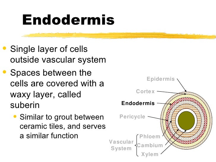 Root endodermis, the innermost cortical layer surrounding the root vasculature, serves as the foremost barrier to water, solutes, and nutrients taken up from soil Endodermis. The endodermis is exclusive to roots, and serves as a checkpoint for materials entering the root’s vascular system A waxy substance called suberin is present on the walls of the endodermal cells This waxy region, known as the Casparian strip , forces water and solutes to cross the plasma membranes of endodermal cells instead of slipping. The root meristems arise in the pericycle found immediately beneath the endodermis (In ferns, and other pteridophytes the lateral roots originate in the endodermis) Usually the lateral roots are restricted to the regions opposite the xylem and come out in vertical rows, the number being equal to that of xylem strands present.