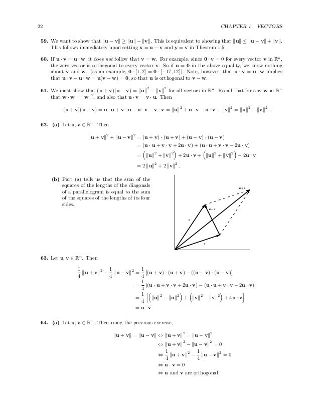 Sep 09, 16 · I would say so, since we have $\forall_{u}\exists_w vu=x Stack Exchange Network Stack Exchange network consists of 176 Q&A communities including Stack Overflow , the largest, most trusted online community for developers to learn,. BASIC PROPERTIES OF CROSS PRODUCTS PETER F MCLOUGHLIN Lemma 1 Suppose u, v and w are vectors in RnIf a cross product exists on Rn then it must have the following properties. But clearly this is true set theoretically (if u 2W 1 and u 2W 2, then of course u 2W 1\W 2), ie W 1 \W 2 is the largest subset of V contained in both W 1 and W 2Since we have shown in the lectures that W 1 \W 2 is also a subspace, we are done 3 Let W 1 and W 2 be subspaces of a vector space V Show that the following statements are equivalent (i) W 1 \W 2 = f0g (ii) If w.